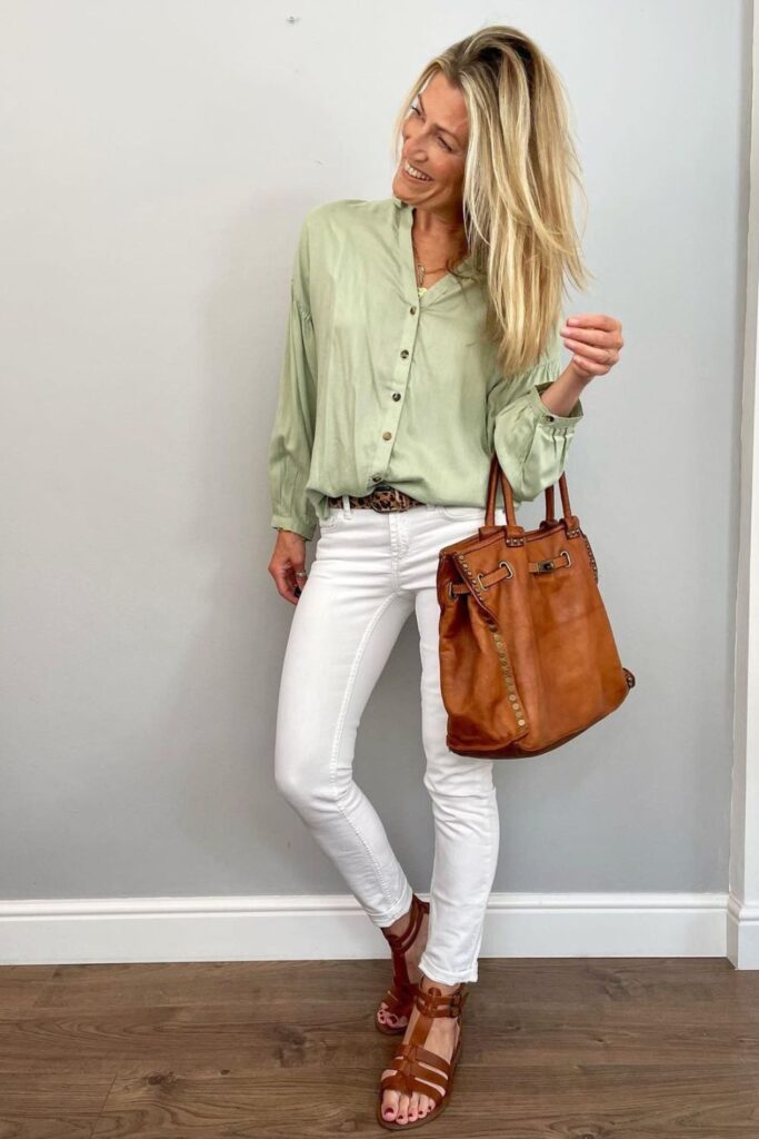 For an outfit that feels both relaxed and put-together, try pairing a sage green loose-fitting button-down shirt with some form-fitting white jeans.